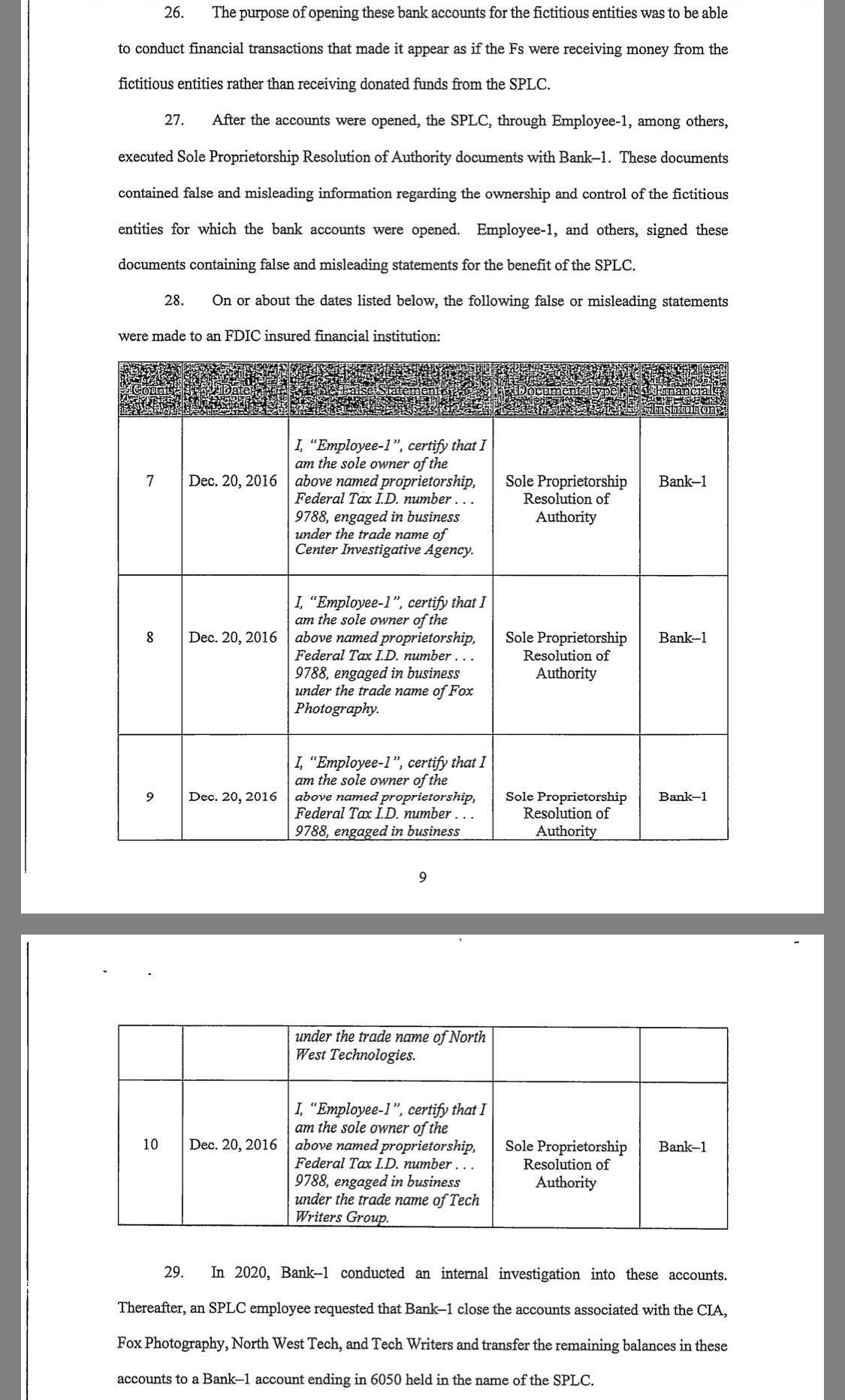 He adds an image of the SPLC’s banking information being used in the the indictment and says
