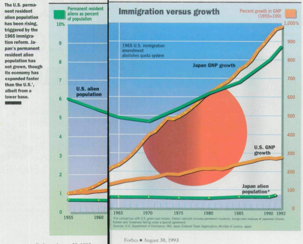 The bottom line: With innovation and better use of its existing labor force, Japan could well continue to prosper without opening its islands to immigration. Recently Forbes asked immigration advocate Julian Simon: Given Japan's apparent demonstration that growth through innovation is a viable alternative, is immigration necessary for the U.S. economy?