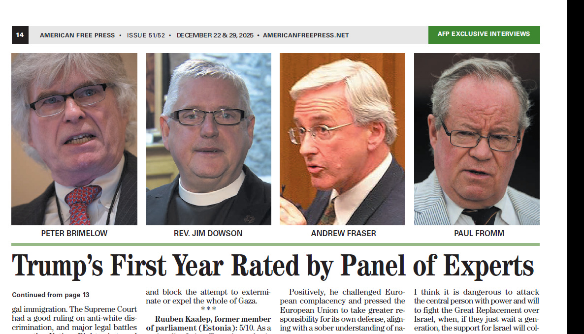PETER BRIMELOW WRITES: James Edwards, host of the Political Cesspool radio show, asked a number of us to grade Trump’s first year for the December 22-29 2025 issue of American Free Press, where he is a columnist. The result has been picked up by Kevin MacDonald’s Occidental Observer (here) and Ron Unz’ Unz Review (here). Both allow comments.