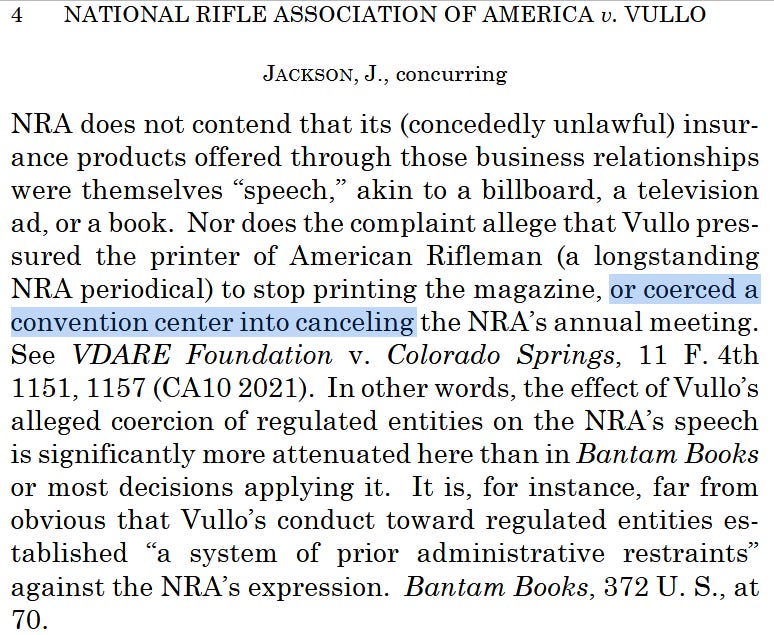 So they couldn’t keep paying the legal fees. The only thing I’d add to this excellent report is that the NRA., you may recall won a free speech case against New York State a different a different official just last year for harassing them, using the power of the state to squelch the NRA on they argued because of their speech. It was a little bit more of a more circuitous and interestingly enough, Justice Ketanji Brown Jackson—oh, this was a nine-zero decision, by the way, by the Supreme Court—Justice Ketanji Brown Jackson wrote a concurrence in which she cited VDARE’s case against Colorado Springs, the one I just mentioned to you three times, saying it was a much stronger case than the NRA case.