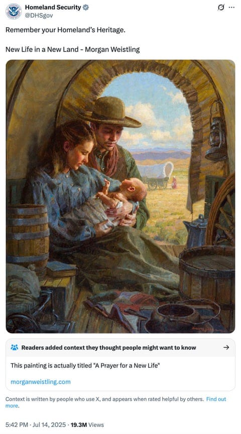VDARE.com and I just made a cameo appearance in ‘The nefarious message behind the DHS ‘manifest destiny’ painting: ‘four pillars of propaganda,’’ by Alaina Demopoulos, The Guardian, July 23 2025.